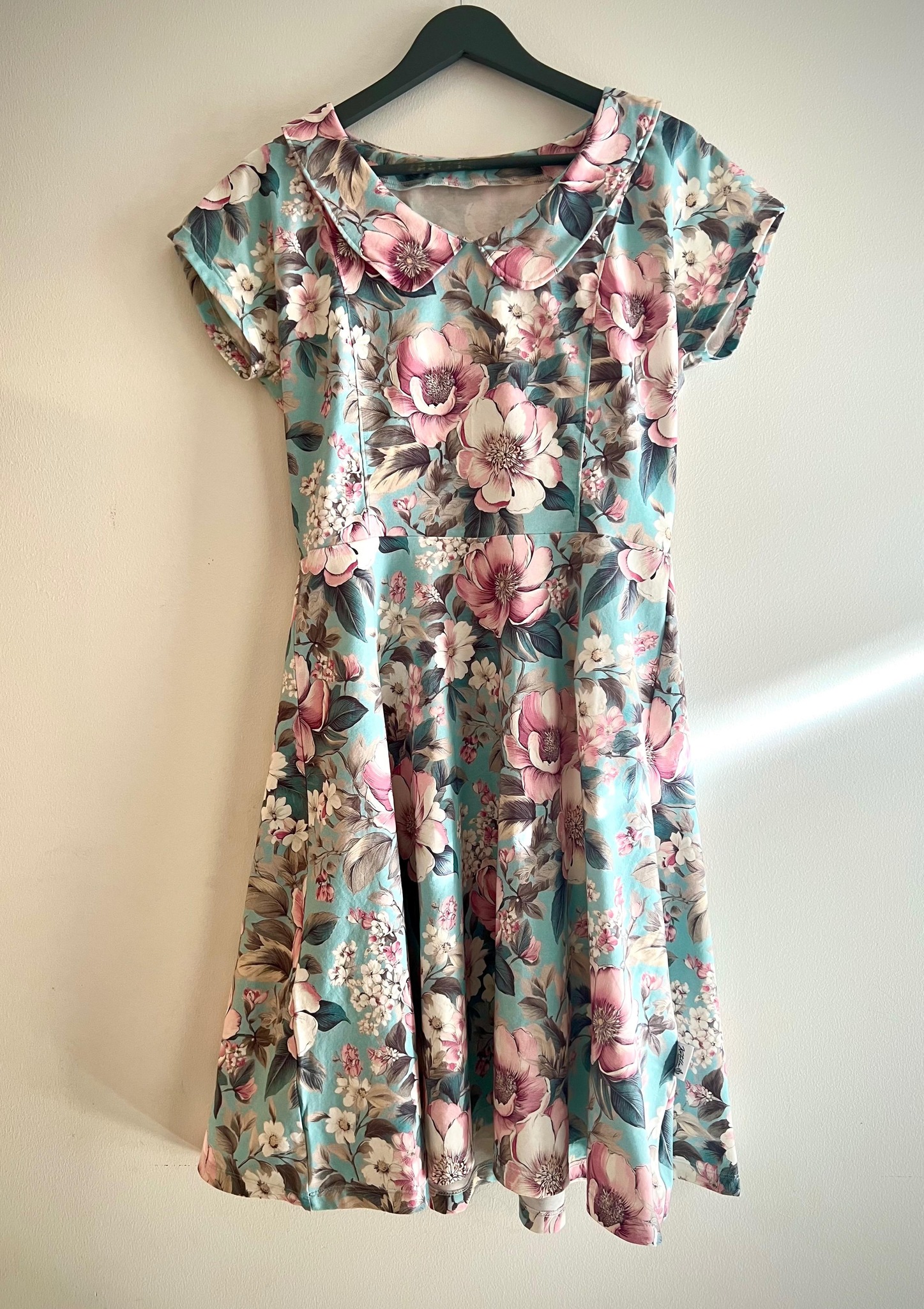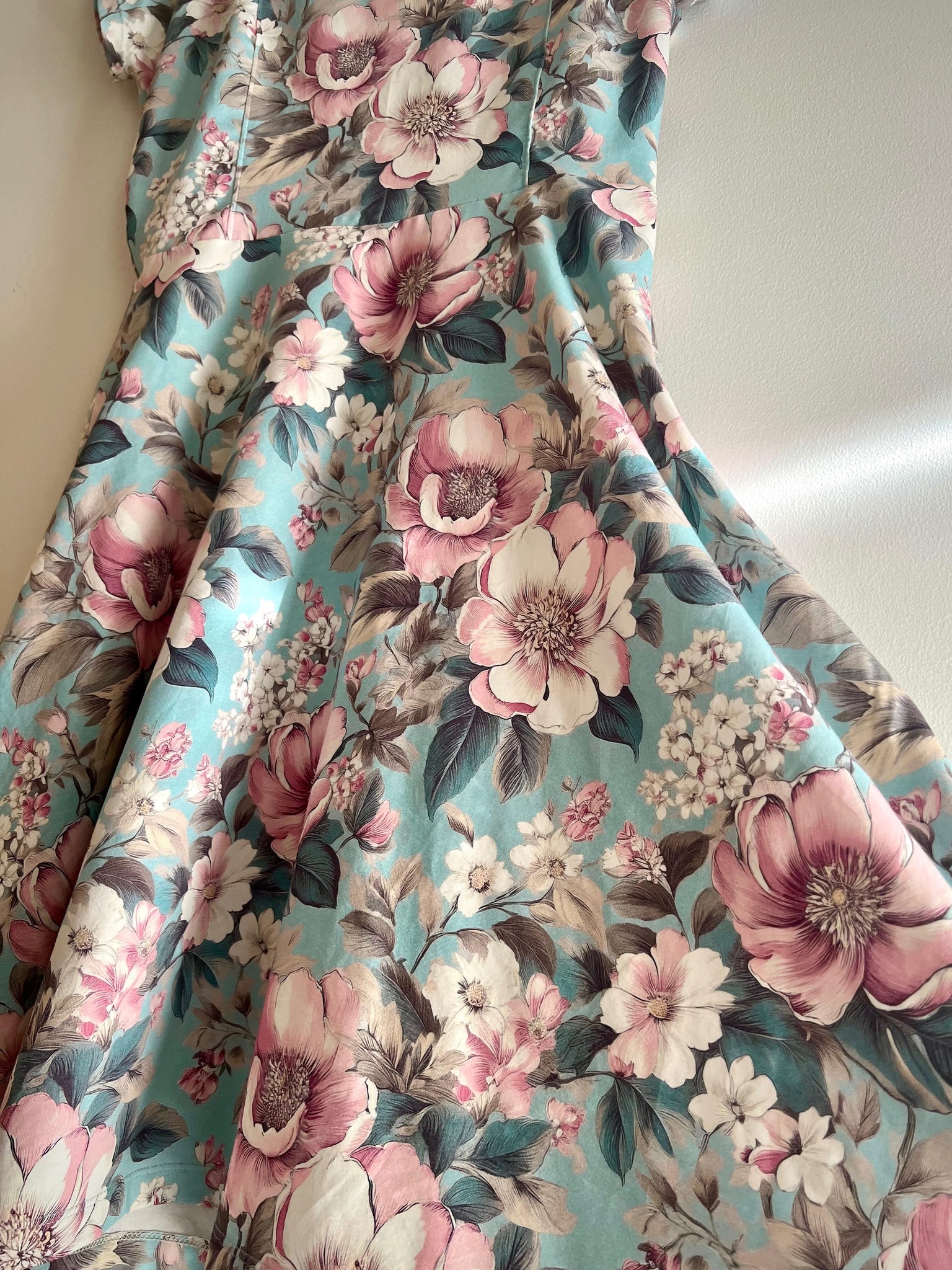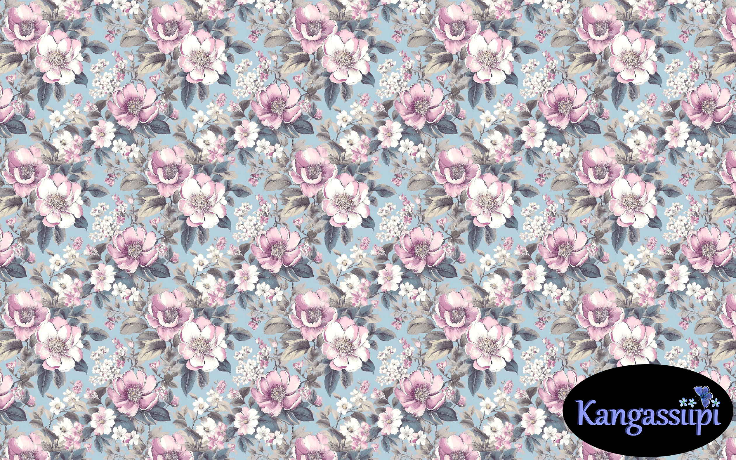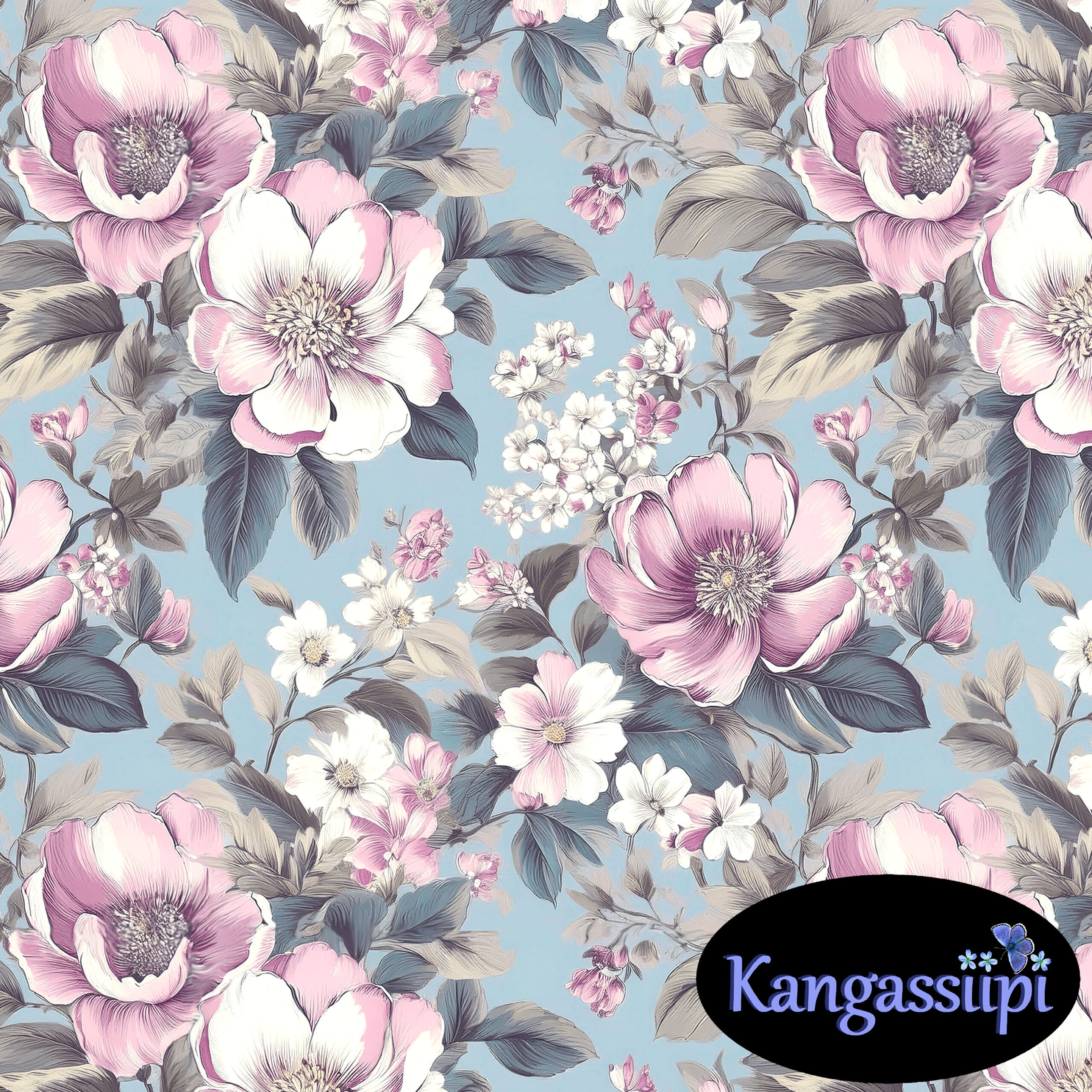 Laadukas omantuotannon puuvilla elastan trikookangas. Oi, todella upeat nostalgiset kukat, trikookankaassa 🩵