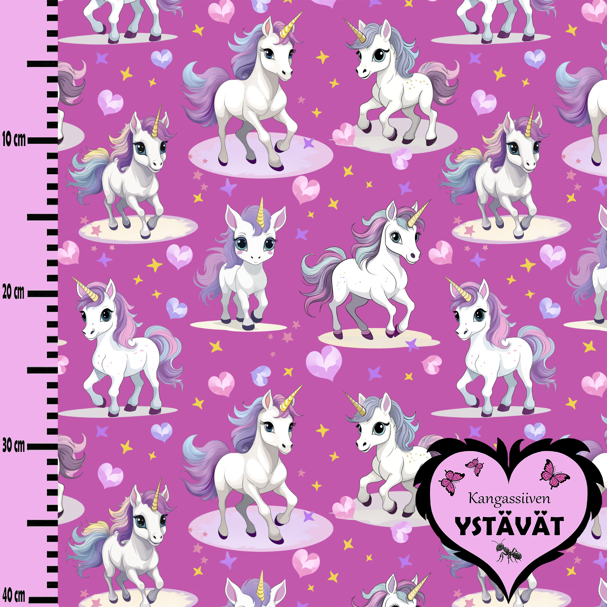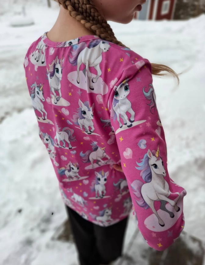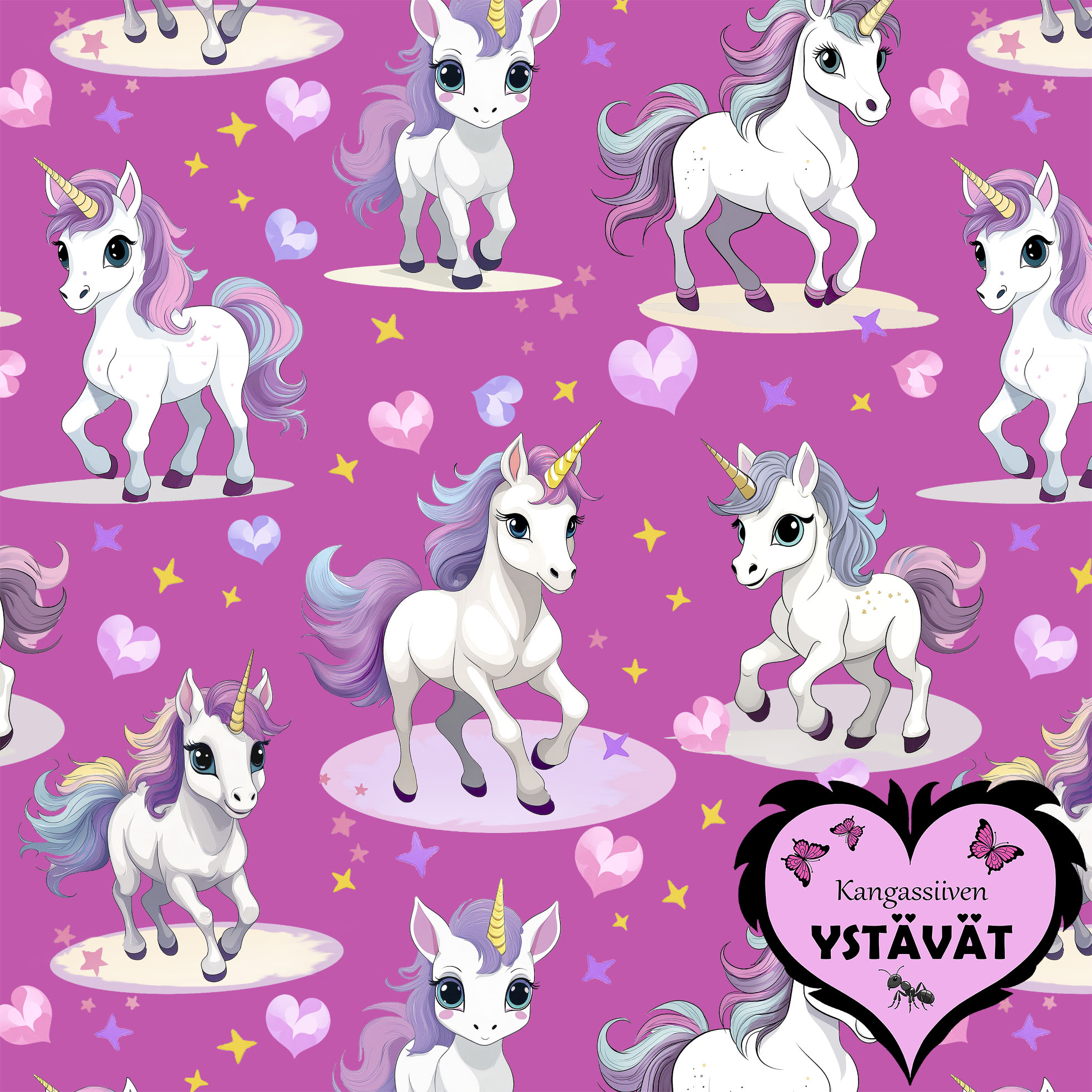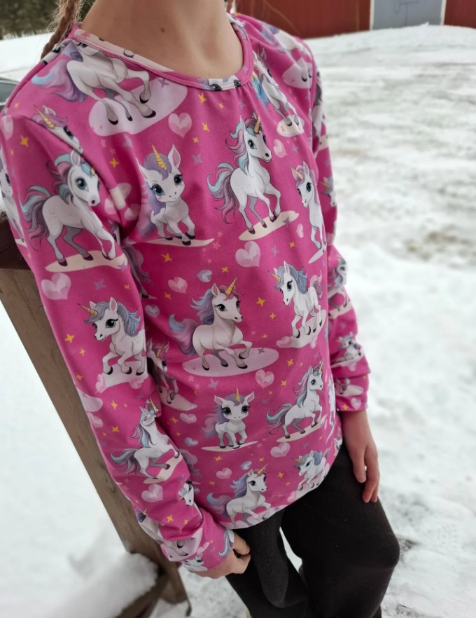 Nyt uusi kuosisarja, selkeä ja värikäs YSTÄVÄT, joka on suunnattu pienemmälle väelle.  Laadukas omantuotannon puuvilla elastan trikookangas, jossa iki-ihanat yksisarviset 🦄
